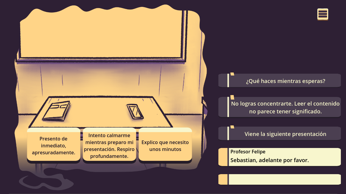 Don't Overthink es un videojuego que simula ambientes academicos para que estudiantes con dificultades sociales puedan practicar de antemano situaciones de estres y recibir retroalimentacion en base a sus decisiones.